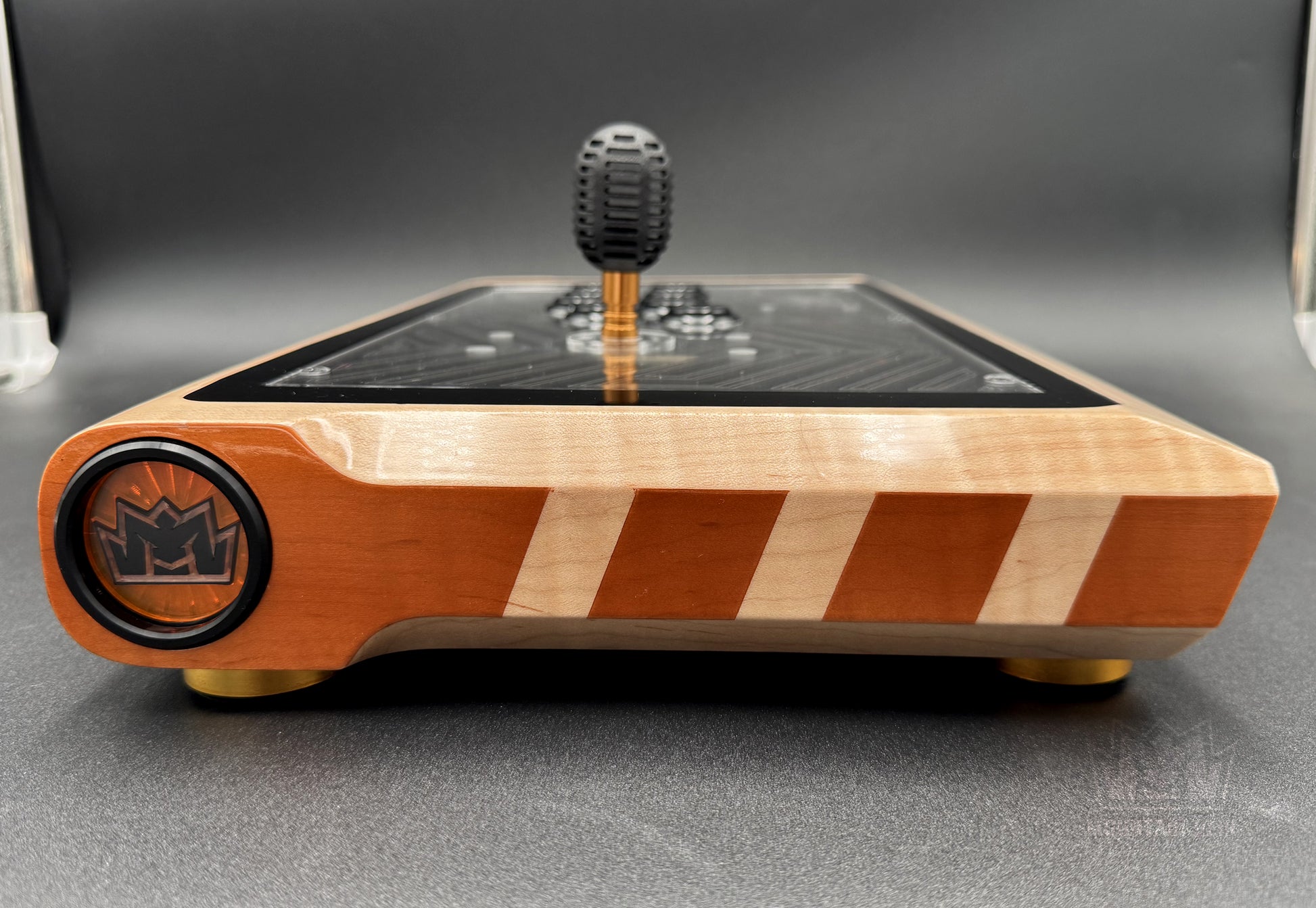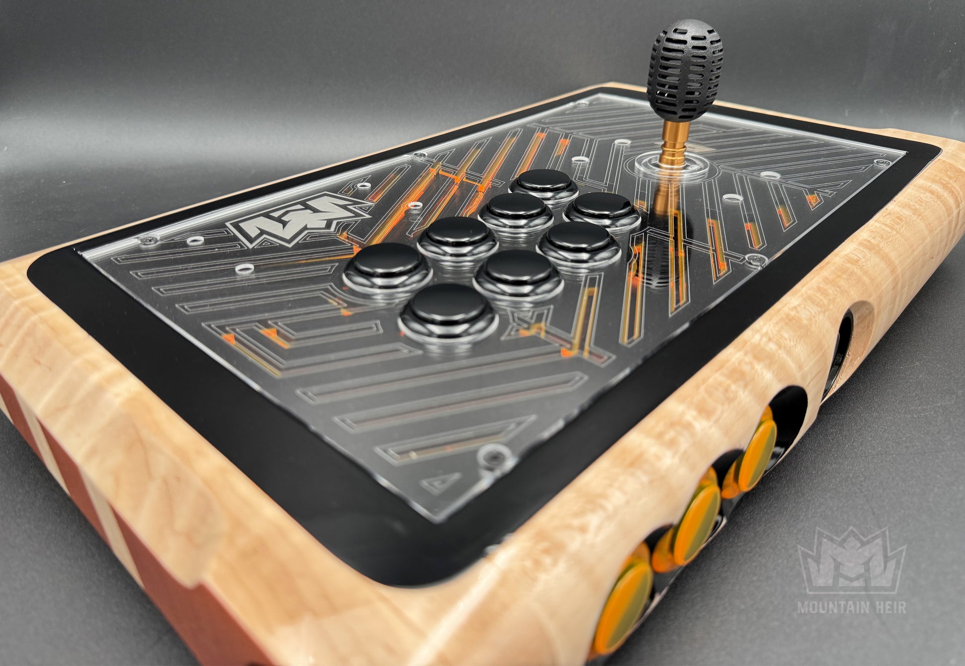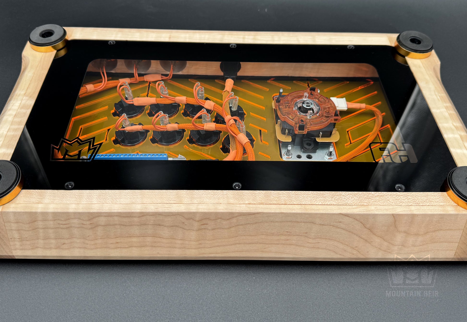 - Material: Solid Maple hardwood, Clear Acrylic, Gloss Black Acrylic, Translucent Orange Acrylic, and Clear Acrylic