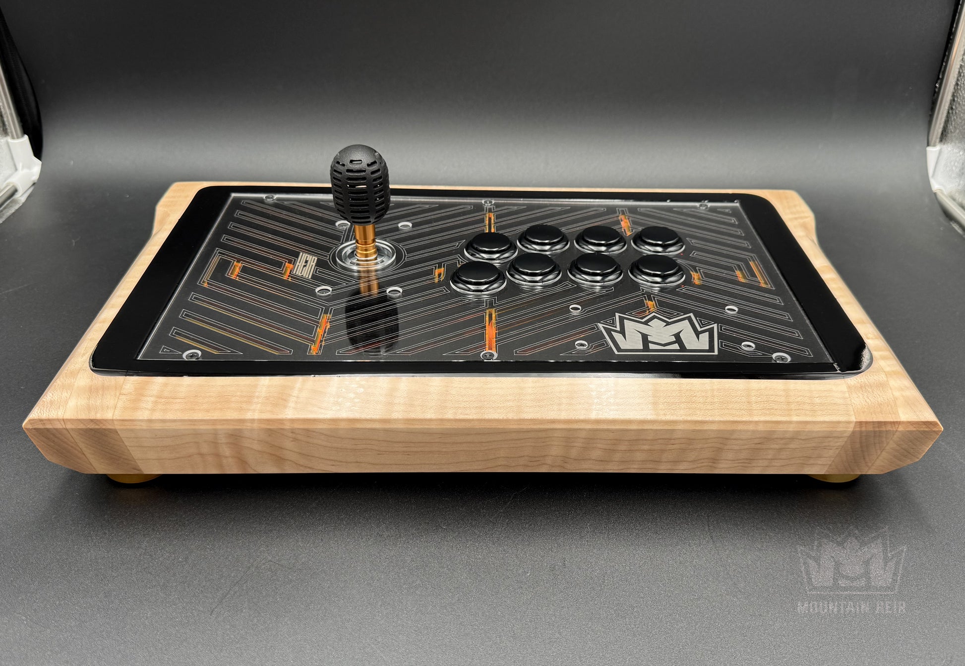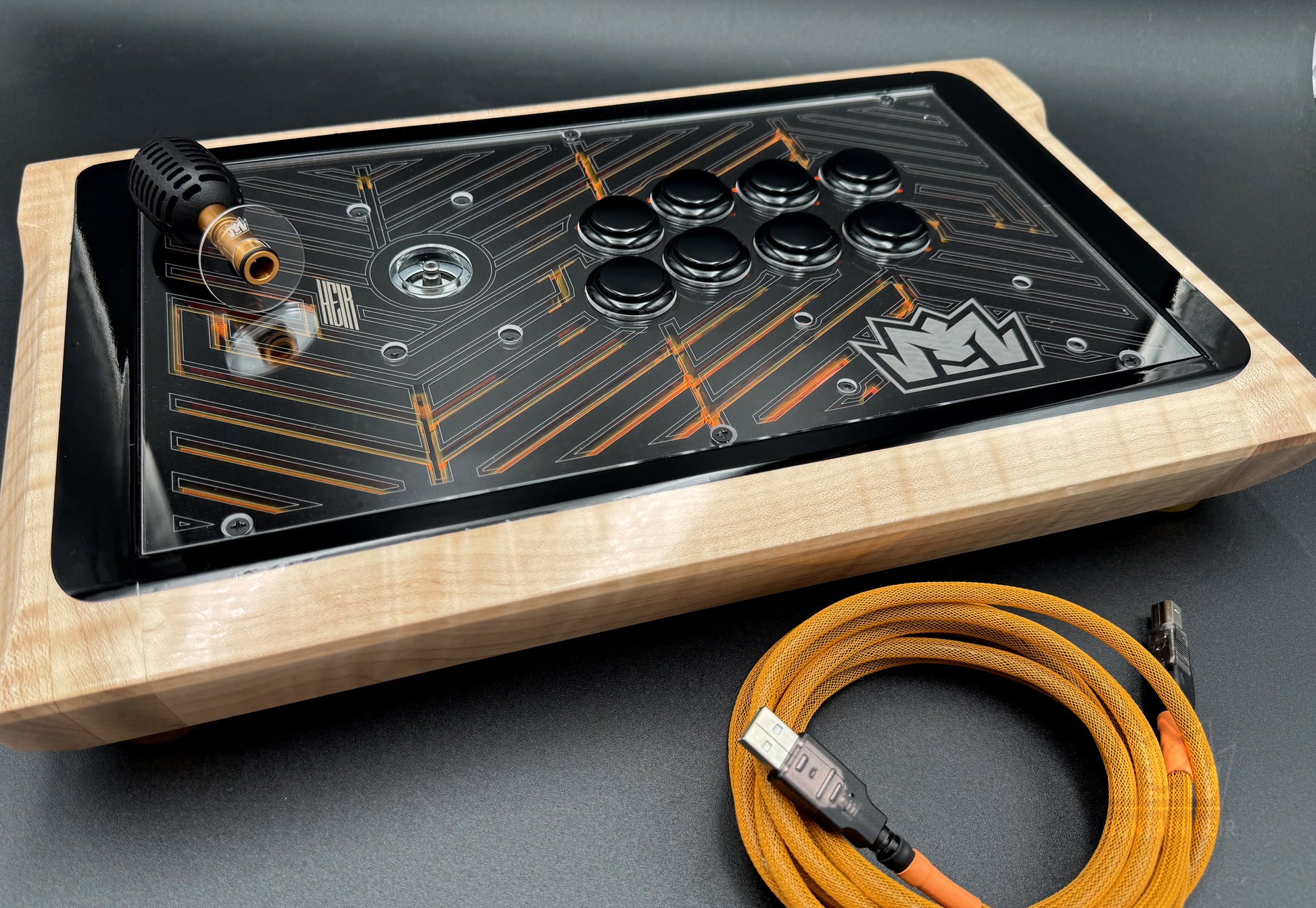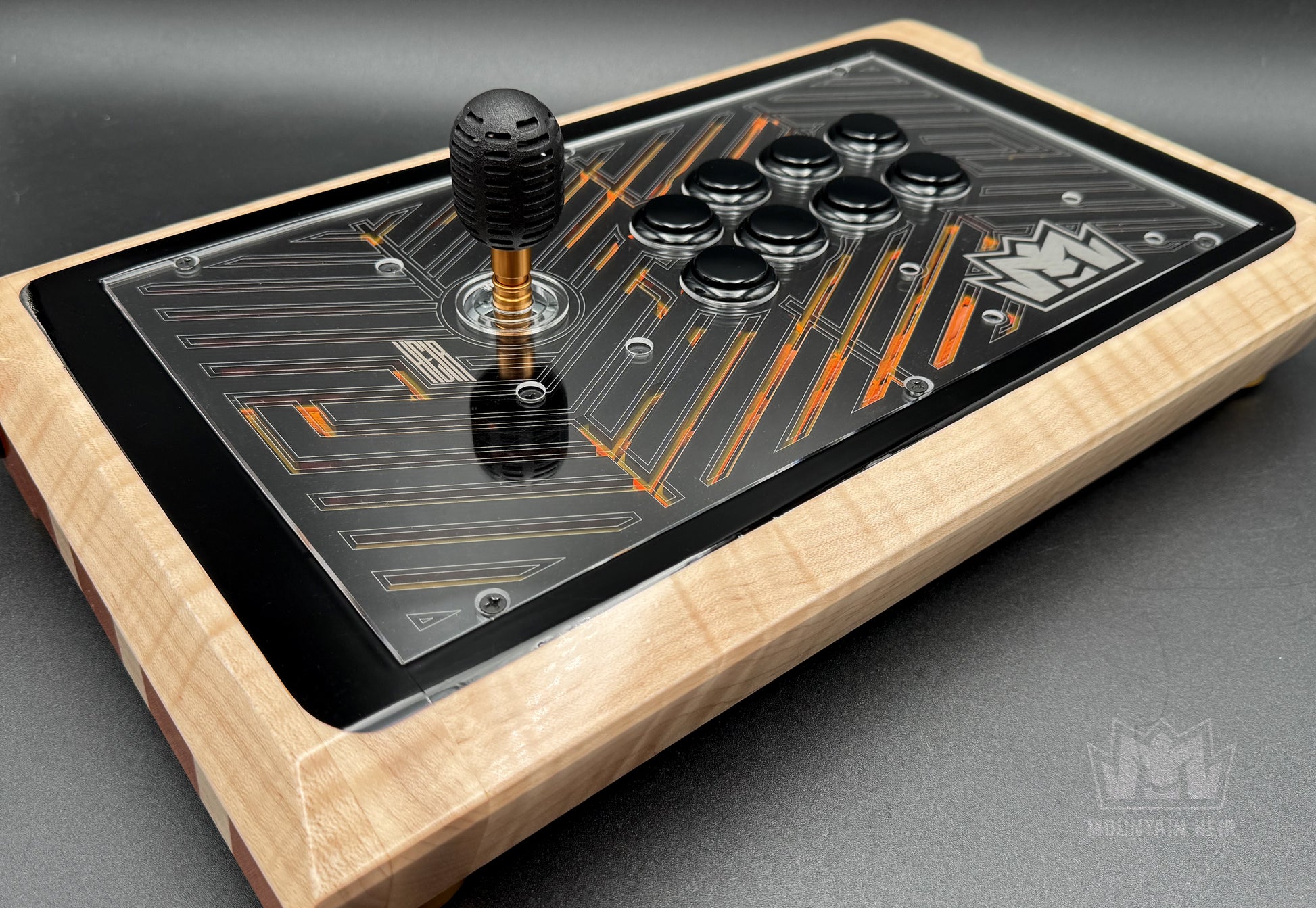 - Material: Solid Maple hardwood, Clear Acrylic, Gloss Black Acrylic, Translucent Orange Acrylic, and Clear Acrylic