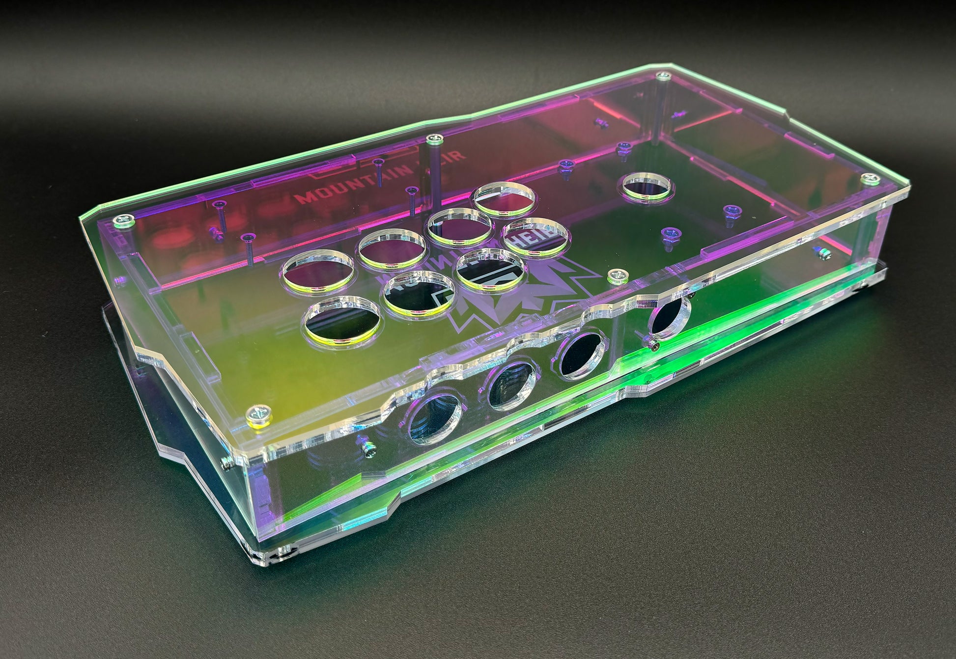 Introducing the first Mountain Heir Co. Original DIY Acrylic Fight-stick/Joystick Case, The Heir Born. This case is sturdy, sleek, and sexy. Made from industrial grade, clear acrylic, in our own unique shape design. This enclosure has a clear sub-frame and clear cover panels that give you full internal visibility. This is the perfect option if you would like to spice up the design with your own artwork - Adobe Photoshop templates are available. It's just the right size, weight, and shape making it a great option for tournament players or players on the go! See below for specs and details.